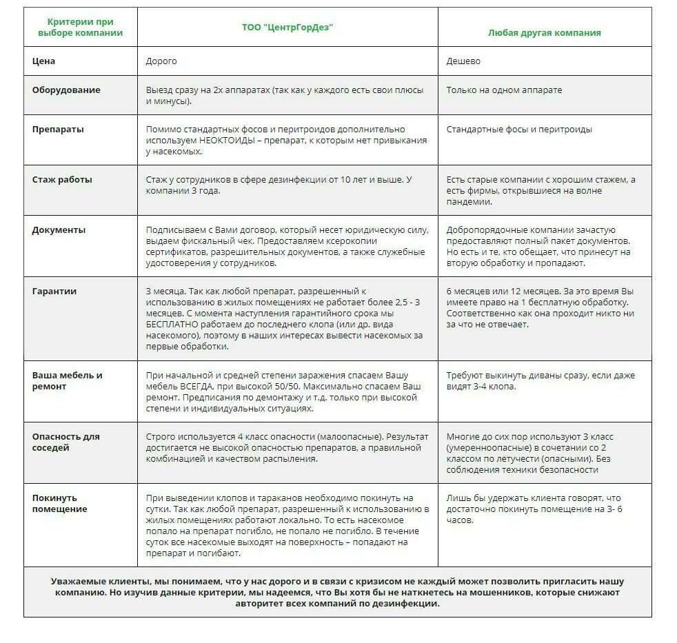 Для нас самое главное, чтобы наши клиенты остались довольными проделанной работой. И поэтому качество наших услуг превыше всего. Мы не экономим на препаратах. Большая часть наших препаратов не имеет сильного запаха, и имеет длительный срок действия.